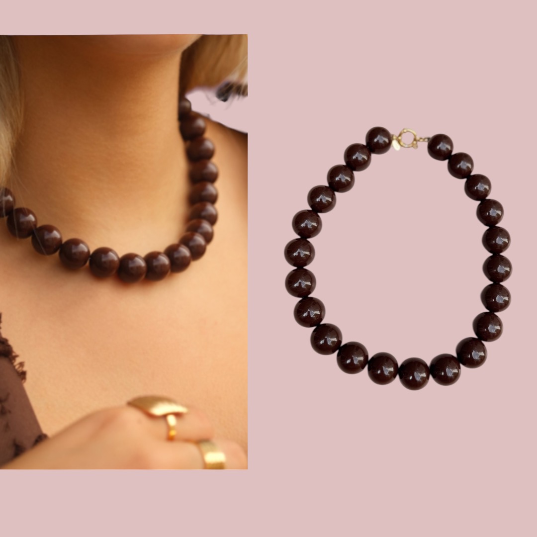 Deze donkerbruine statement ketting met ronde kralen is een stijlvolle eyecatcher die moeiteloos elke outfit naar een hoger niveau tilt. De warme bruintint in combinatie met de glanzende, ronde kralen zorgt voor een klassieke maar toch moderne uitstraling. Of je nu kiest voor casual of chic – deze ketting past zich aan aan jouw stijl.