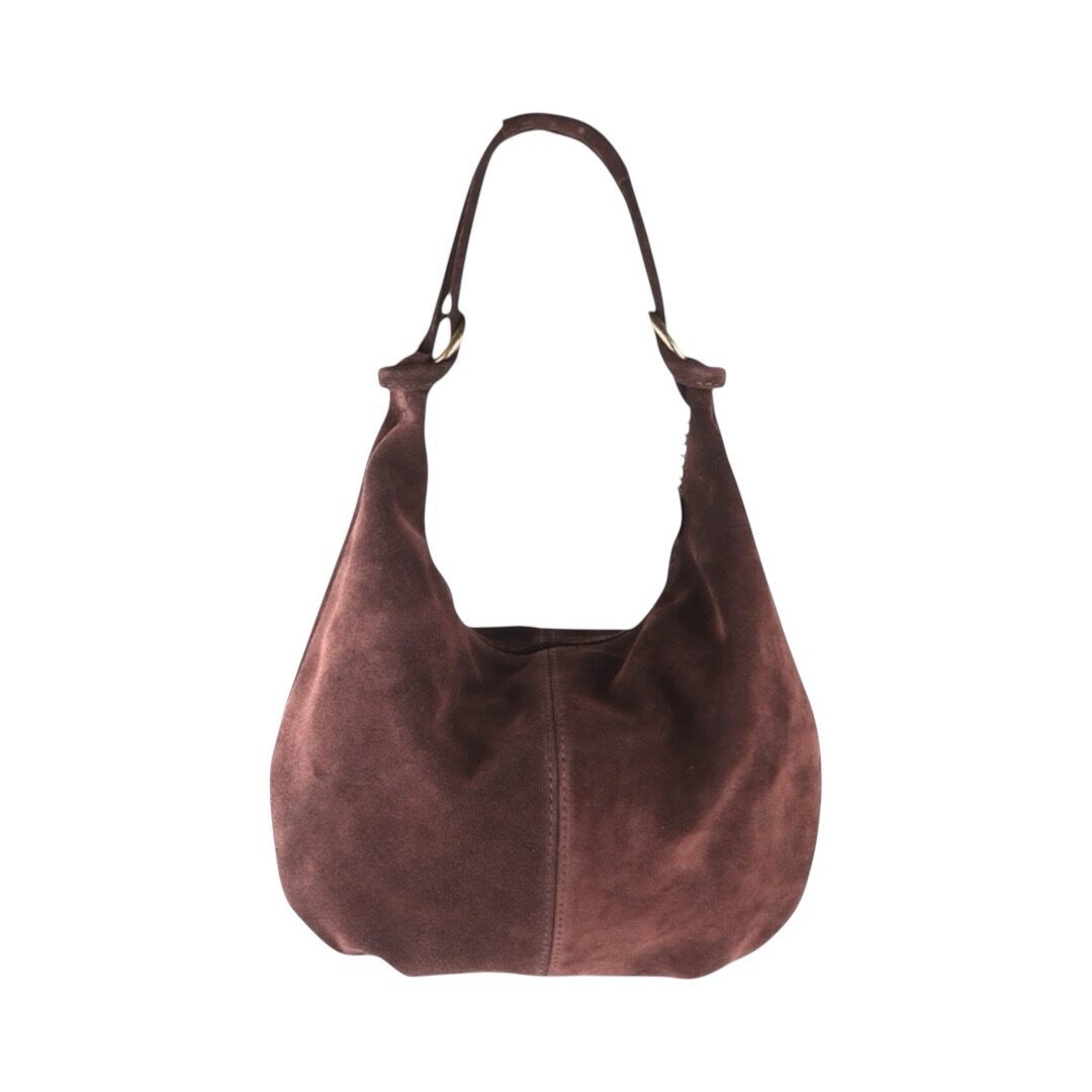 Deze donkerbruine suède schoudertas is gemaakt van 100% echt leer en heeft een zachte hobo-vorm, brede band en antiek gouden details. Stijlvol, casual en ideaal voor dagelijks gebruik.
