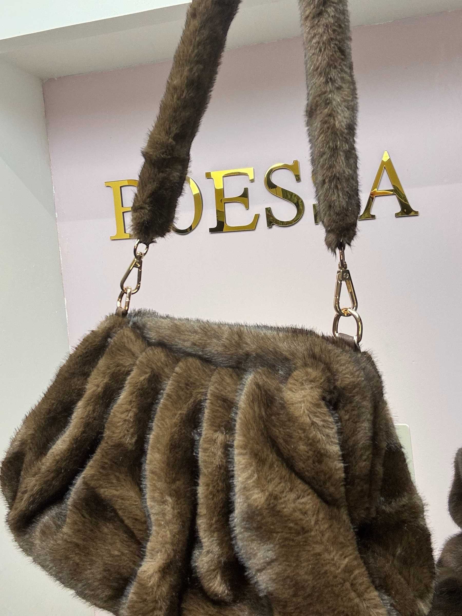 Elegante nep bont tas met brede schouderband. Verkrijgbaar in bruin en beige, zacht fake fur en stijlvol te combineren met onze bontlook jassen.
