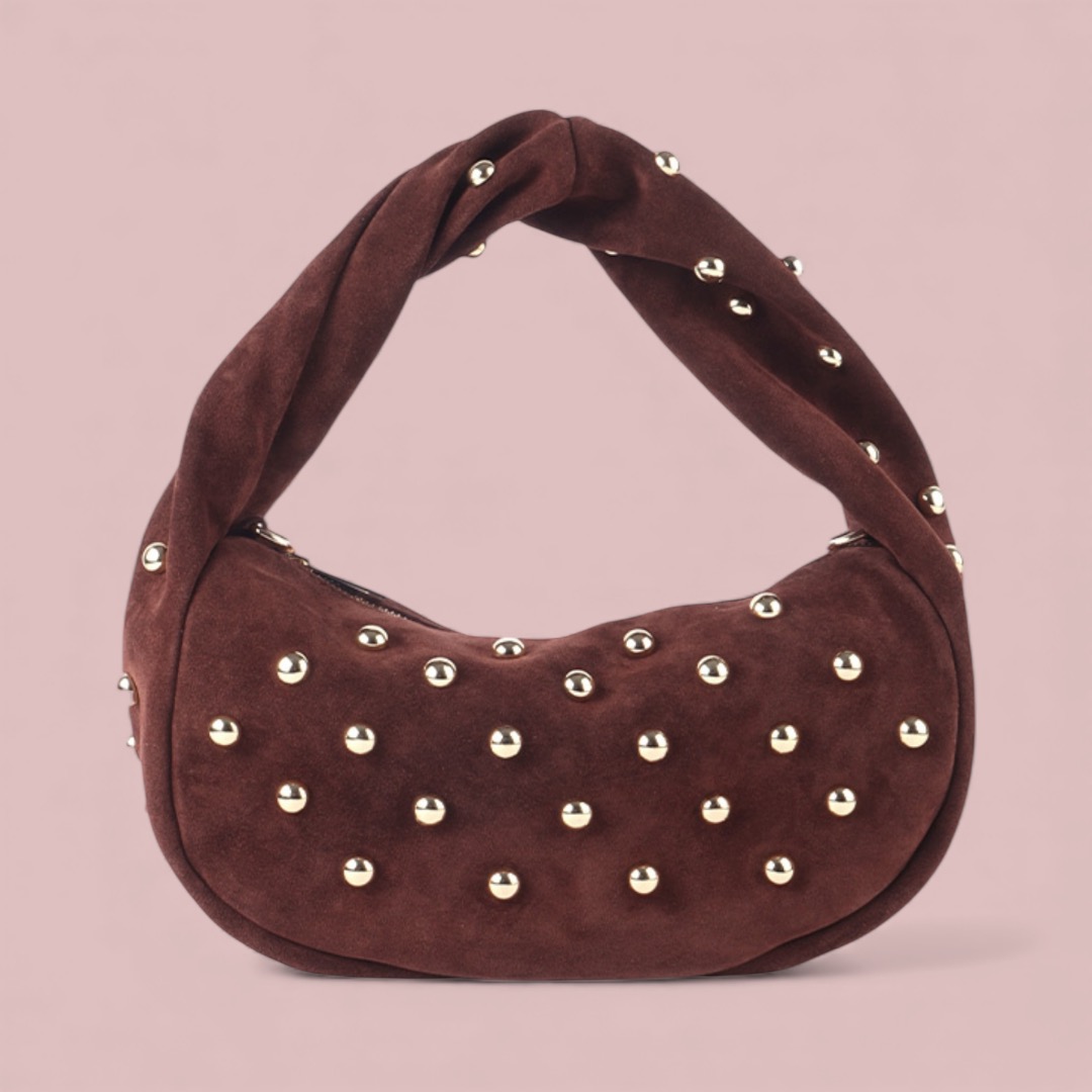 Deze Suede handtas met stuts is een perfecte mix van elegantie en stoerheid. De tas is uitgevoerd in een diepe, donkerbruine kleur en vervaardigd van zacht suède leer. Het ontwerp springt direct in het oog dankzij de goudkleurige ronde stuts die over de gehele tas zijn aangebracht — inclusief het gedraaide handvat. Dit geeft de tas een luxe en tegelijkertijd edgy uitstraling.