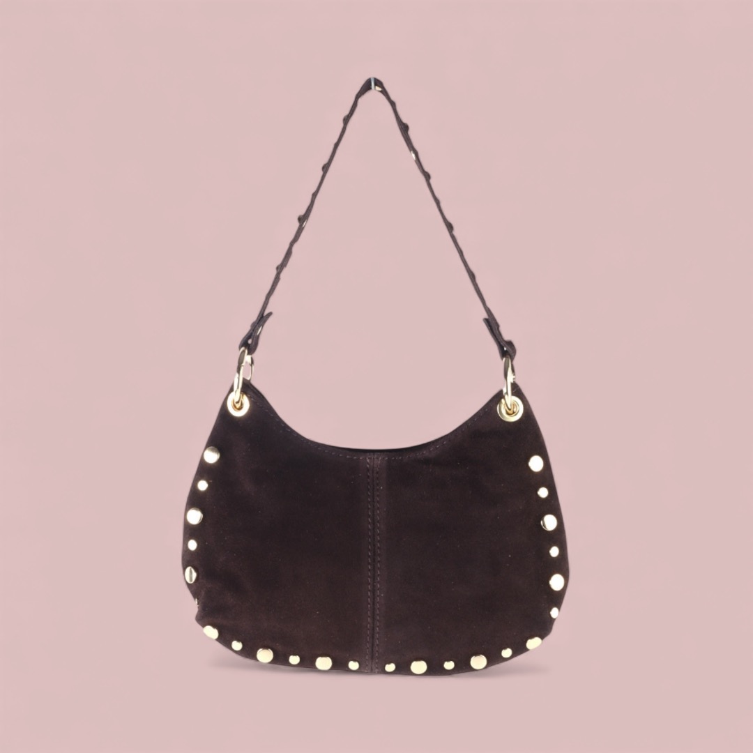 Of je nu naar een lunchafspraak gaat, een shoppingmiddag hebt gepland of stijlvol de avond in wil, deze tas is helemaal van nu. De combinatie van materiaal, vorm en details maken de Suede Leather Studs Bag tot een onmisbaar item in jouw garderobe.Suede Handtas met Gouden Stuts – Donkerbruine Schoudertas in Hobo-Stijl
