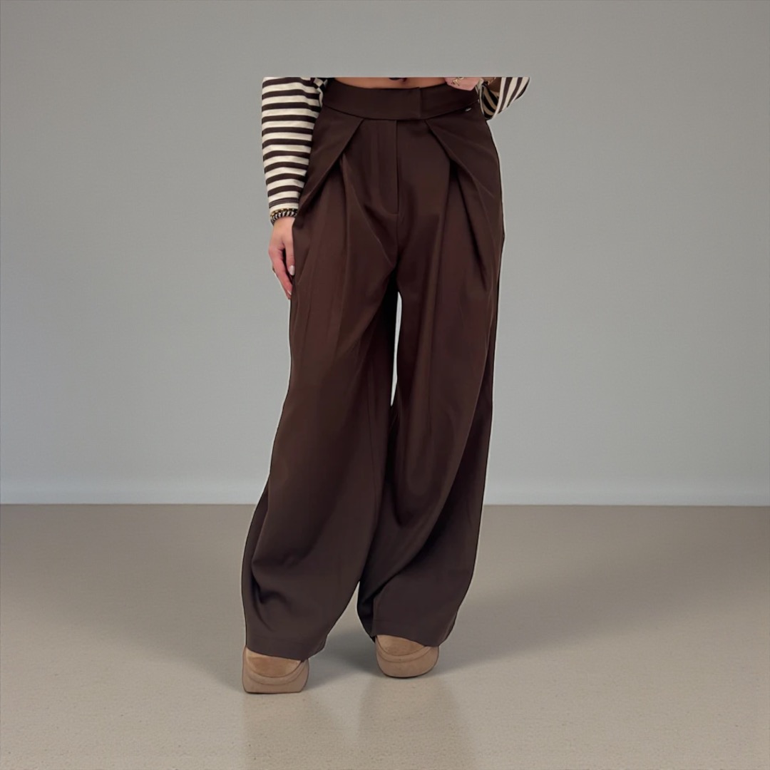 Trendy wide leg pantalon met hoge taille, diepe plooien en soepelvallende stof. Verkrijgbaar in chocoladebruin en grijs.