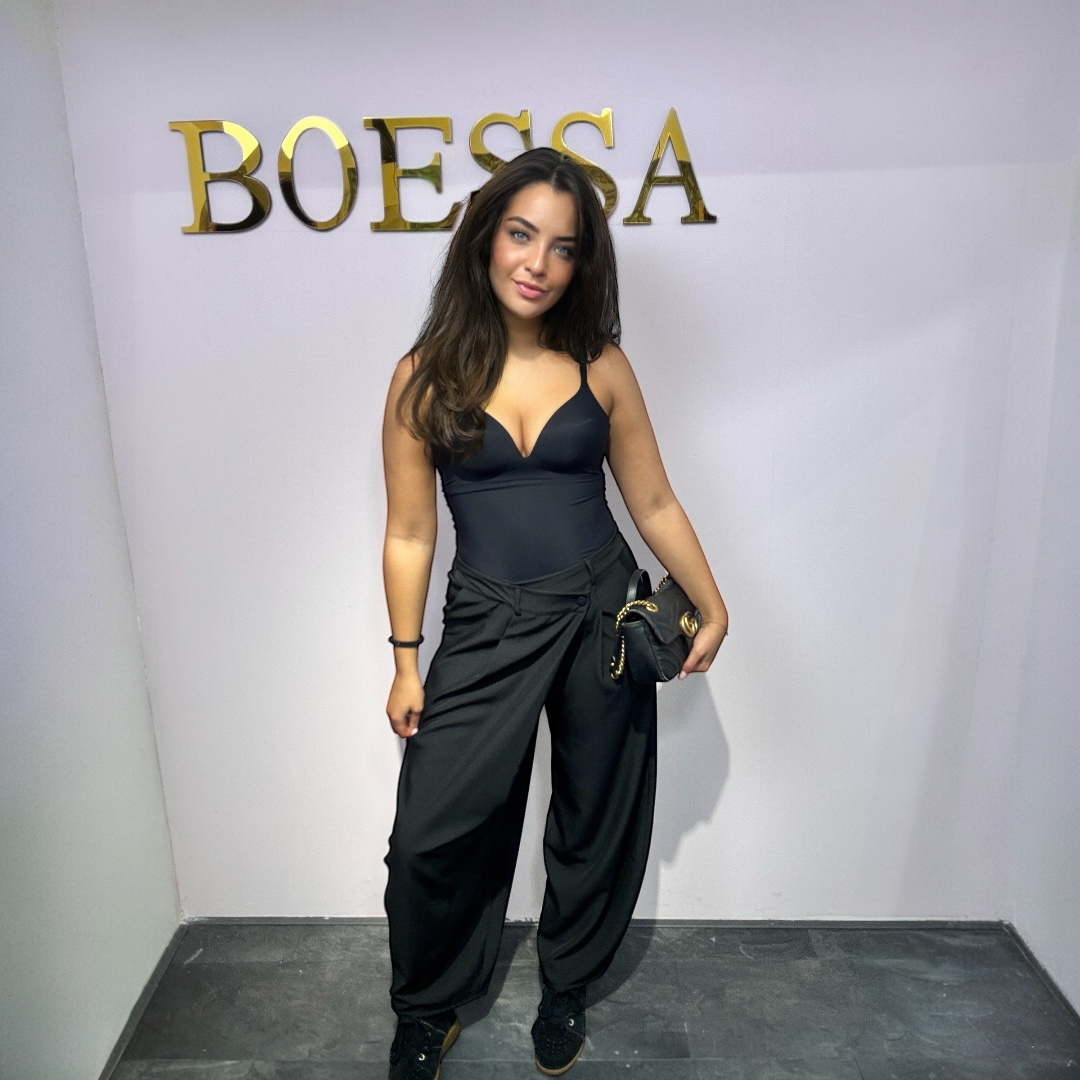 En nu komt het: deze broek is een match made in fashion heaven met het topje dat Sarah aanheeft op de foto. Die zwarte body stocking is dé combi. Zo draag je ‘m naar een diner, feestje of gewoon: omdat jij dat wil.