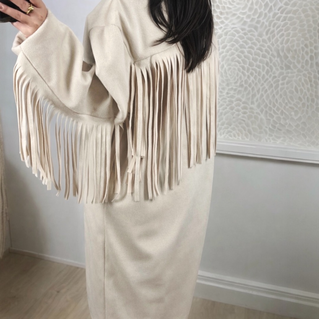 Wat deze beige manteljas met franjes echt bijzonder maakt, zijn de speelse franjes langs de mouwen die doorlopen over de rug. Dit geeft de jas een unieke en trendy uitstraling die je niet vaak ziet. De franjes zorgen voor een subtiel bewegend effect, waardoor jouw outfit direct meer opvalt. Een echte must-have voor vrouwen die houden van fashion met een twist.
