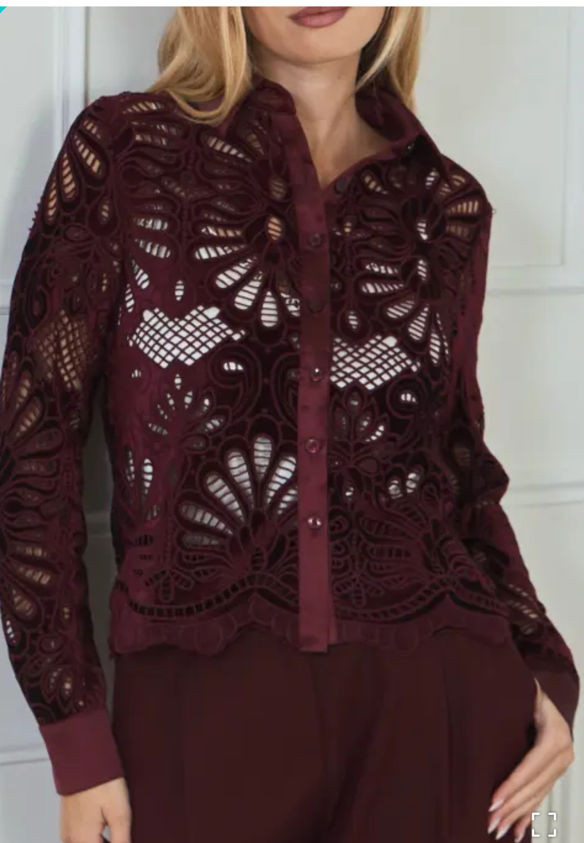 Deze bordeaux kanten blouse met zijdenkraag is zo’n item waarvan je meteen denkt: dit is speciaal. De kleur, het kant, de glanzende details – alles klopt. Je voelt je er meteen vrouwelijk én stijlvol in.