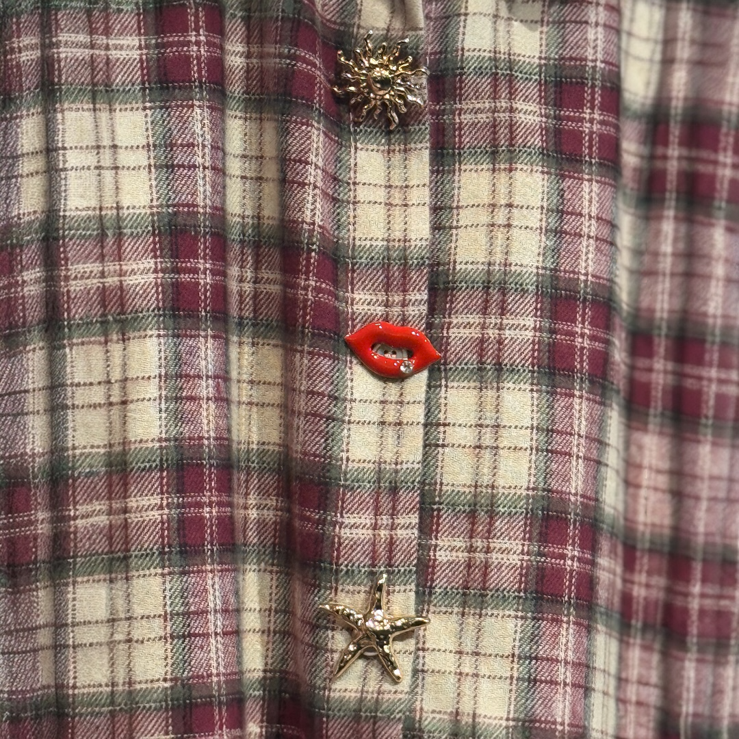 Op zoek naar een blouse die nét dat beetje extra heeft? Dan is onze geruite dames blouse in bordeauxrood met afneembare broches een perfecte keuze. Deze blouse combineert het klassieke ruitpatroon met een verrassende twist: de knoopjes zijn versierd met kleine broches die je eenvoudig kunt afnemen of wisselen. Zo geef je de blouse telkens een nieuwe uitstraling.