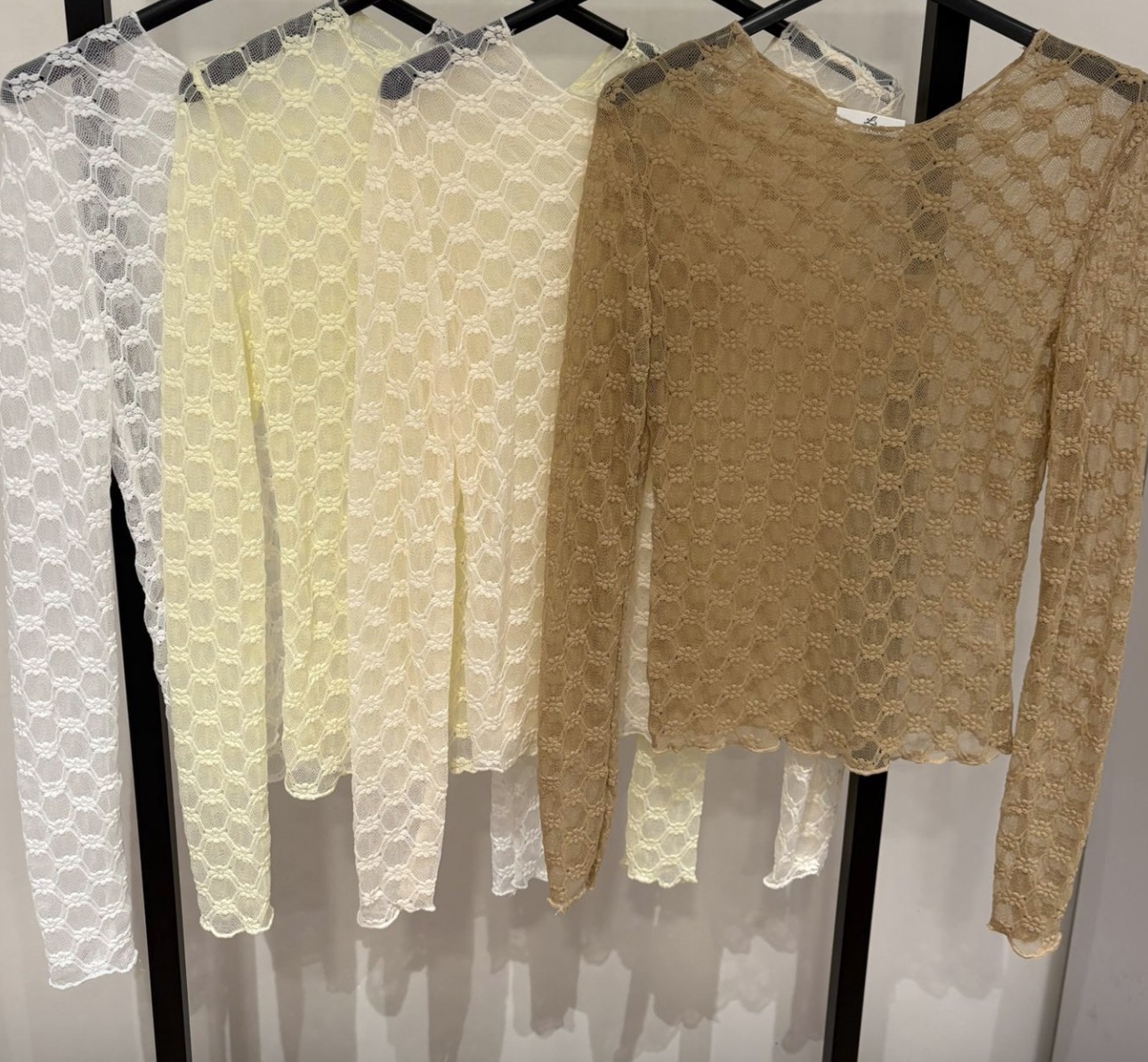 Deze kanten long sleeve top is een mooi aansluitend lace truitje met lange mouwen en ronde hals. Perfect om onder een blazer of blouse te dragen. Verkrijgbaar in wit, geel en taupe en one size draagbaar tot ongeveer maat 44.