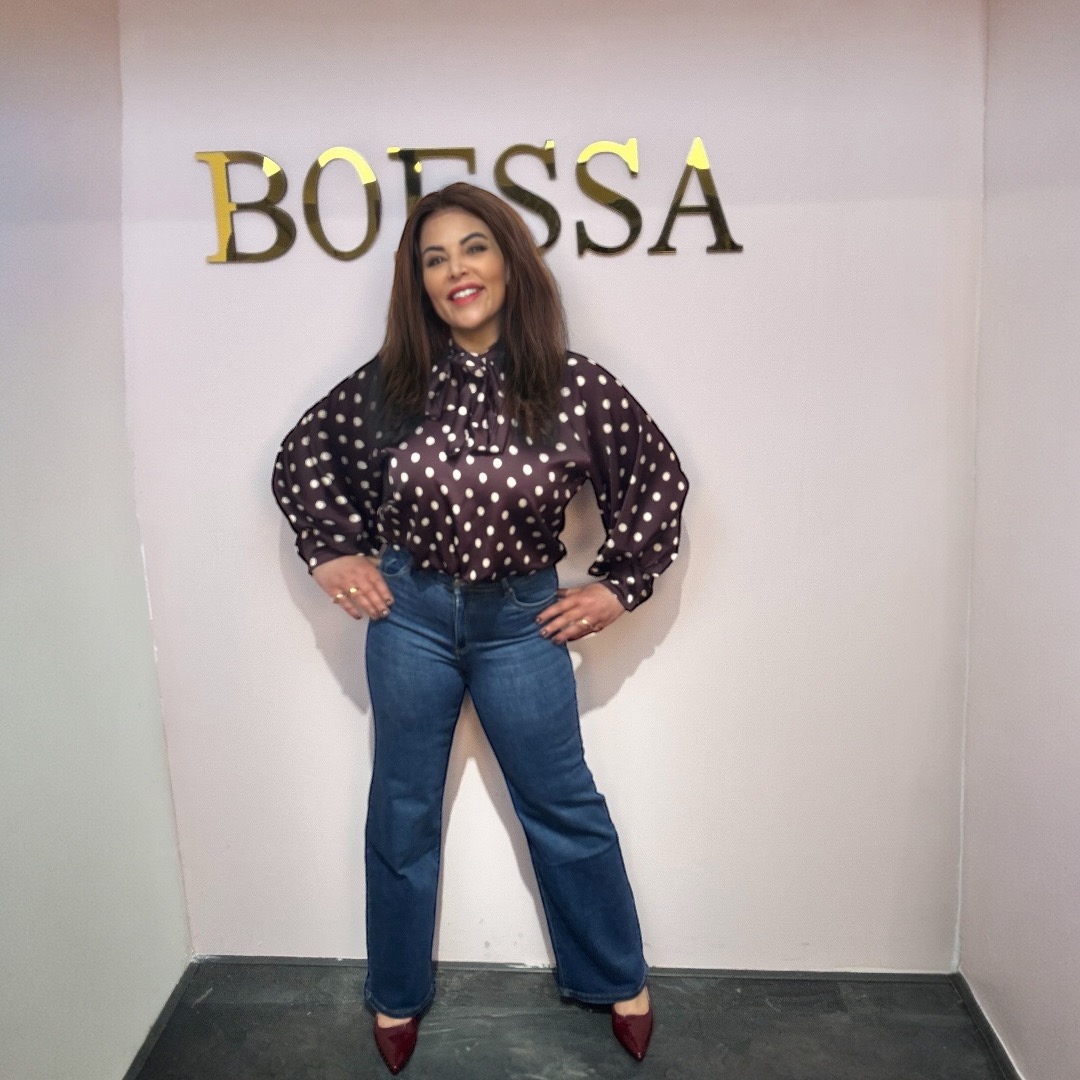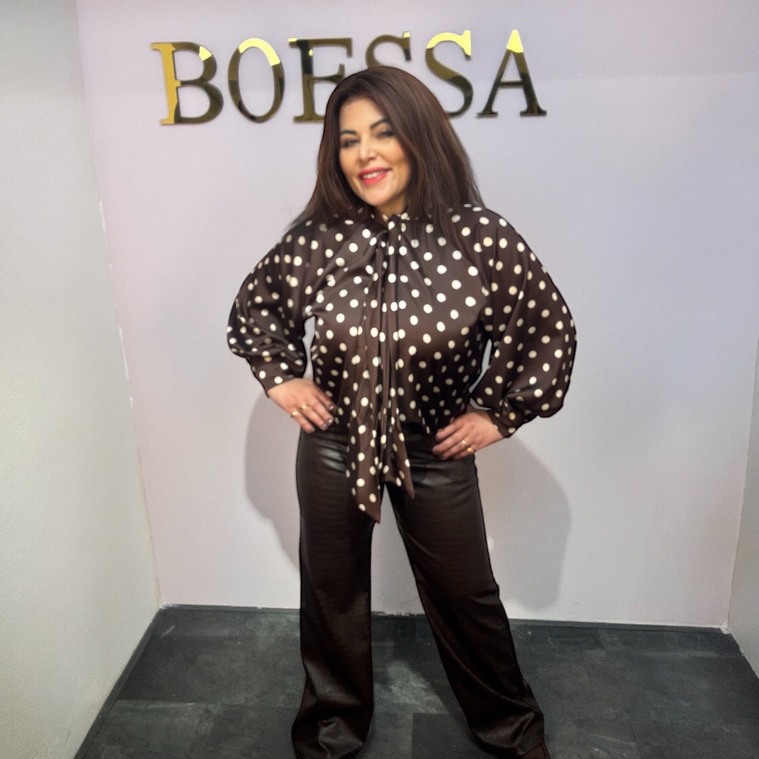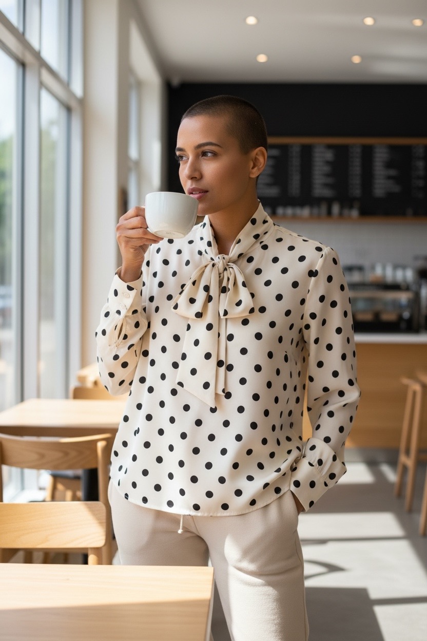 Wat deze blouse zo bijzonder maakt, is de balans tussen klassiek en speels: de glanzende satijn, de strik, de ronde stippen – alles klopt. Dit is zo’n kledingstuk dat je elke keer weer uit de kast trekt als je iets speciaals wilt dragen zonder te overdrijven.