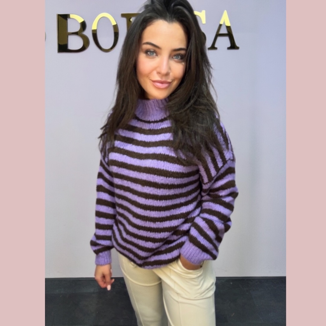 Ben je op zoek naar een zachte, comfortabele én stijlvolle trui? Dan is deze stripe knittrui lila bruin een perfecte keuze.