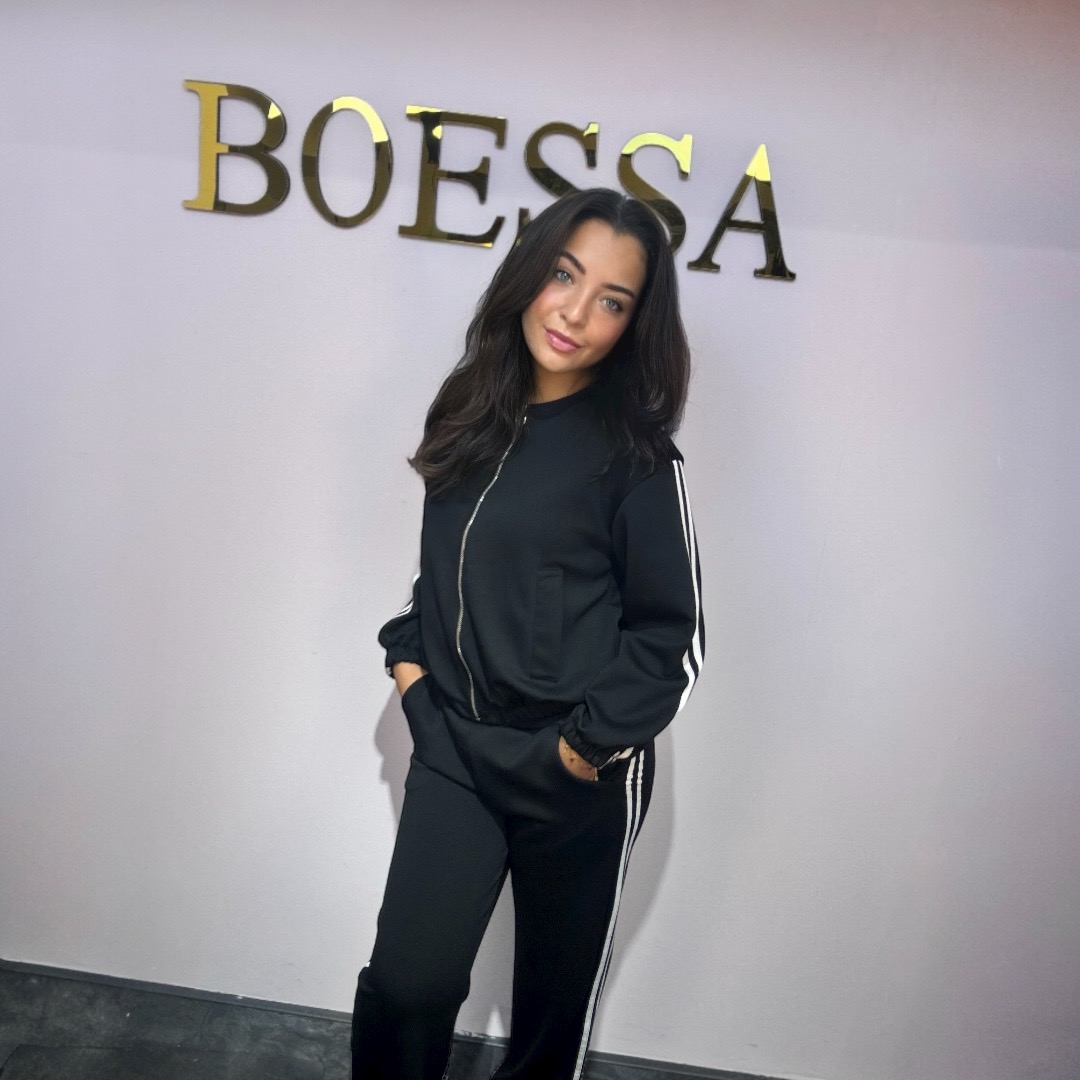 De comfyset bomber striped is een stijlvolle en comfortabele keuze voor iedere dag. Deze tweedelige set bestaat uit een moderne bomberjas en een sportieve broek, beide voorzien van tijdloze streepdetails die het geheel een frisse, trendy uitstraling geven. De strepen op de mouwen van de jas en langs de zijkant van de broek zorgen voor een slank, sportief silhouet dat perfect past binnen de athleisure trend.