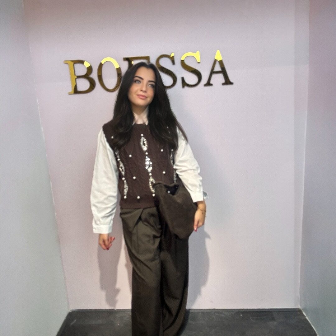 De blouse heeft een mooie rechte vorm, lange mouwen en een frisse, nette look die je outfit direct oplicht. De donkerbruine spencer valt er perfect overheen en de pareldetails zorgen voor die extra touch die dit setje nét even anders maakt dan standaard blouses of truien. Samen vormen ze een stijlvol geheel dat je kunt dragen naar werk, etentjes, feestjes of gewoon een dagje shoppen.